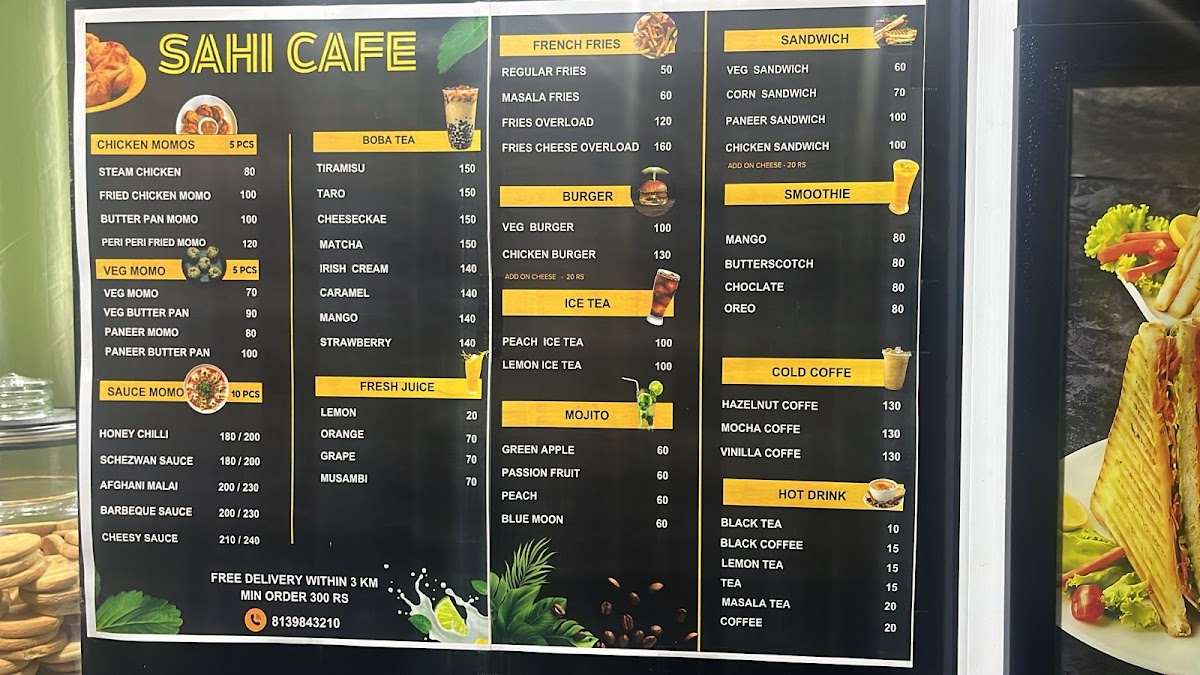 The menu at SAHI CAFE is a delightful exploration of flavors, with a focus on refreshing drinks and delectable snacks. A highlight is their enticing selection of Boba Tea, featuring tempting flavors such as Tiramisu, Strawberry, and Matcha, all priced at a value of ₹150.00. If you prefer something fruity, don't miss out on their Smoothies, available in flavors like Mango and Oreo for just ₹80.00. Each sip promises to be a burst of flavor, making you wish you could savor it forever.